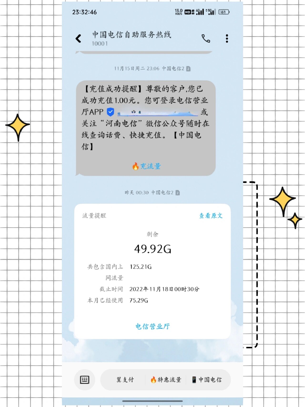 中国电信短信查询话费中国电信短信查询话费方式便捷实用。用户只需发送特定短信至查询号码,即可快速了解话费余额。此服务操作简单,实时更新,为用户提供及时准确的账户信息,是日常通信管理的贴心助手。... 2025-09-28 - [阅读全文]